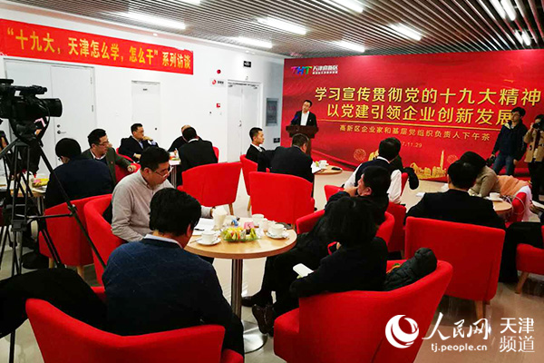 人民网天津12月6日电 (唐心怡)近日,天津高新区企业家和基层党组织负责人座谈会在高新区党群活动服务中心举行。作为由中共天津市委网信办和人民日报社人民网天津频道联合主办的“十九大,天津怎么学,怎么干”系列访谈活动之一,此次宣讲报告会上,高新区两委领导、各部门主要负责人、高新区部分基层党组织代表、企业家代表百余人汇聚一堂,以灵活多样的形式,深入学习宣传贯彻党的十九大精神,切实加强高新区非公企业党的建设,以党建促进非公企业健康发展。