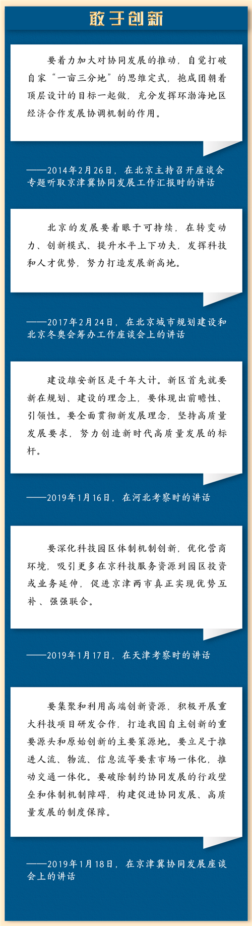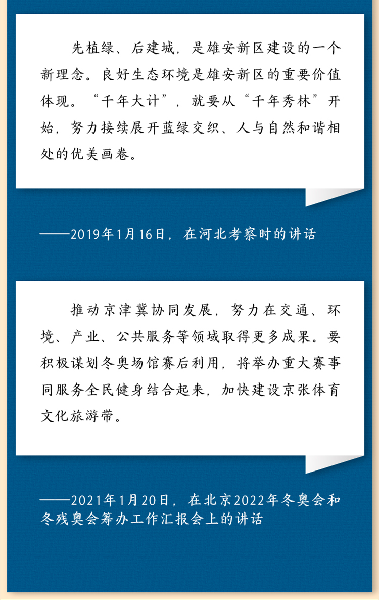京津冀山同脉、水同源、人相亲、地相连,原本就是“一家人”。7年前,习近平总书记站在中国版图前去审视这片广袤大地,作出将“京津冀协同发展”上升为国家战略的重大部署,要求三地“自觉打破自家‘一亩三分地’的思维定式,抱成团朝着顶层设计的目标一起做”。“京津冀协同发展是一个系统工程,不可能一蹴而就,要做好长期作战的思想准备。”“要从全局的高度和更长远的考虑来认识和做好京津冀协同发展工作,增强协同发展的自觉性、主动性、创造性,保持历史耐心和战略定力,稳扎稳打,勇于担当,敢于创新,善作善成,下更大气力推动京津冀协同发展取得新的更大进展。”............7年来,一趟趟调研、一次次论证,总书记跳出“一城一地”得失来思考发展路径,从国家发展全局的高度去擘画和推动,为京津冀协同发展指明方向。如今,京津冀从各自为政、各管一摊,到相互扶持、彼此协助;从发展战略不清、功能重叠,到优势互补、统筹布局……“一加一大于二、一加二大于三的效果”日渐显现。2021年是“十四五”规划开局之年,如何促进京津冀携手下好“一盘棋”,推动京津冀协同发展迈向更高水平?本文特梳理总书记相关讲话要点,与您一起学习。