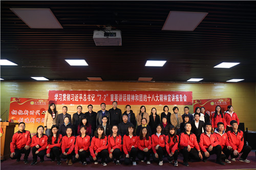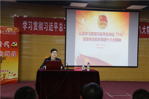 11月28日下午,团委在贝博敏学楼三楼报告厅成功举办“天农名家讲堂”--学习贯彻习近平总书记“7•2”重要讲话精神和团的十八大精神宣讲报告会,校党委副书记王刚清参加并讲话。本次宣讲报告会邀请到团中央宣讲团成员、团十八大报告文件组成员、团中央维护青少年权益部协调督导处副处长李天国担任主讲嘉宾。校学工部部长、团委书记、马克思主义学院党支部书记高艳,马克思主义学院教师代表、全校专职团干部、青马班学员及优秀团干部、团员代表等共230余人参加宣讲报告会。