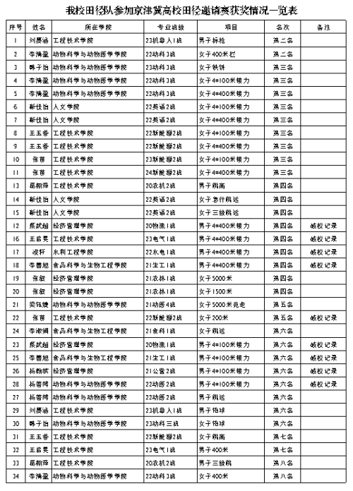 本次比赛,工程技术学院刘墨涵同学在男子标枪项目中荣获亚军;张苗同学在女子200米项目中以29″37的成绩获得第五名,并打破了2011年由张晓玲同学创下的校纪录。