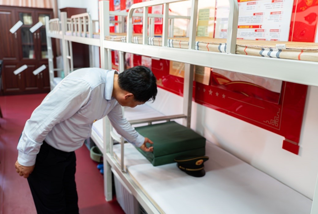 随后,宋涛与正在分批观摩教官宿舍的军训学生进行交流。窗明几净的宿舍,棱角分明的“豆腐块”被褥,生活物品井然有序的摆放,充分展现了军人优良的生活作风。宋涛谈到,内务整理是体现军训成果的重要方面,要深刻理解纪律严明的重要性,将这种纪律意识融入训练、宿舍生活以及将来的学习之中,宿舍成员应当共同努力,在今后的生活中遵循军训期间的内务标准,维护宿舍的整洁,培养自律品质,实现自我提升,成就更好的自己。