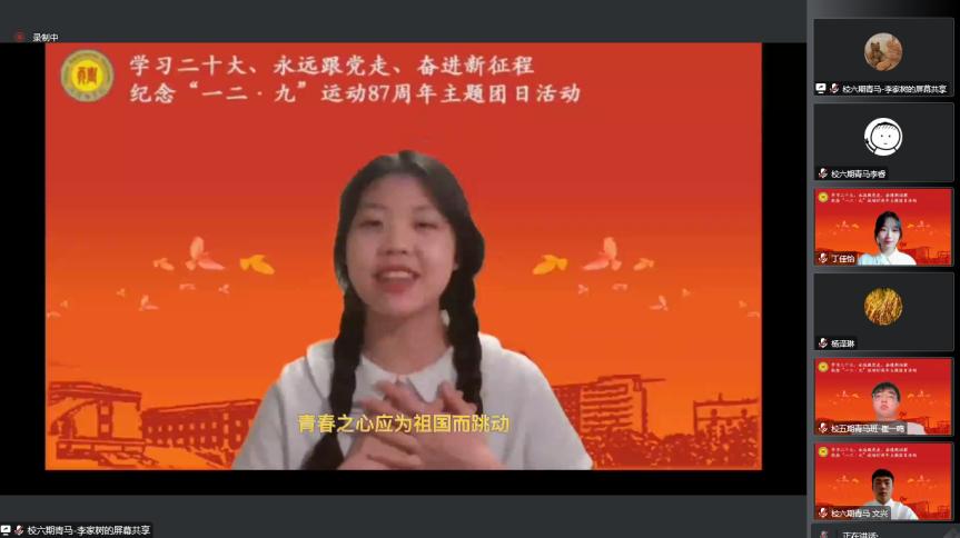 活动在庄严嘹亮的国歌声中拉开帷幕。随后,在校第五、六期青马学员共同演唱的歌曲《少年》中,师生共同回顾了校第五期青马班的精彩瞬间,一同见证了青马学员的成长和进步。
