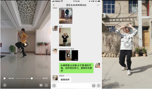 开学首周,23位体育教师组建了202个体育班级微信群,在线学习的总人数达6004人,老师们共制作教学视频270余期,纠偏纠错1500余人次,师生在线互动5000余次。老师们采用微信接龙、知到签到等方式进行考勤管理,以录播、线上教学视频等方式提供学习资料,针对学生反馈练习视频教师即时点评纠错,积极与学生进行线上互动,整个教学过程丰富多彩。