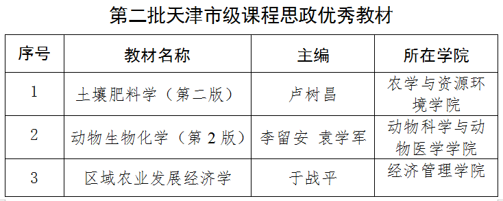 近日,天津市教委发布了《关于公布第二批天津市级课程思政示范课程、课程思政优秀教材和首批天津市级课程思政优秀案例(本科)评选结果的通知》《关于公布首批天津市级普通高校优秀基层教学组织评选结果的通知》,贝博有4门课程获批为第二批天津市级课程思政示范课程,3部教材获批为第二批天津市级课程思政优秀教材,2个案例获批为天津市级课程思政优秀教学案例,农学与资源环境学院农学系获首批天津市优秀基层教学组织。