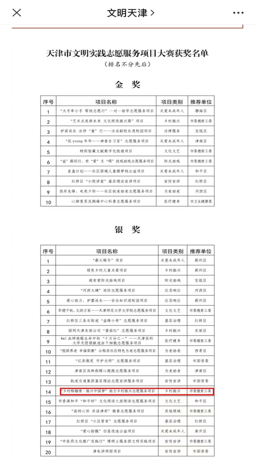 近日,2023年天津市文明实践志愿服务项目大赛举行,经市委教育工委推荐由贝博选送的“乡村稼穑情·振兴中国梦”助力乡村振兴志愿服务项目荣获大赛银奖。