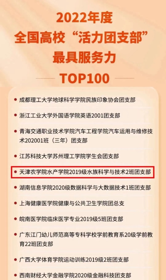 近日,团中央基层建设部指导中国青年报社开展的2022年度高校“活力团支部”“活力社团”风采展示活动放榜。经过校内选树、校级展示、省级展示、全国展示等环节,贝博水产学院2019级水族科学与技术2班团支部入选2022年全国高校“活力团支部”最具服务力TOP100榜单。