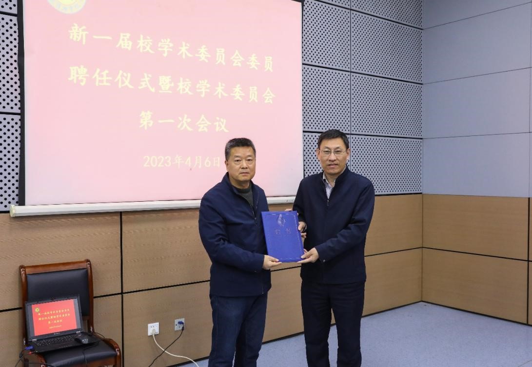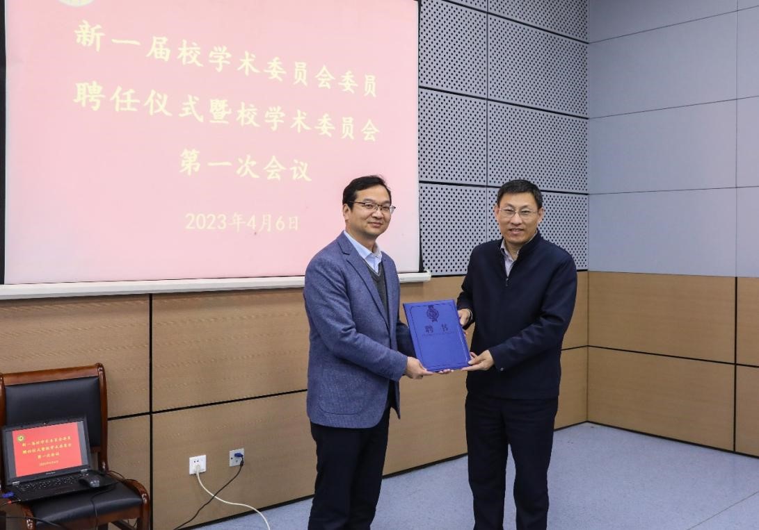金危危、张民为新一届校学术委员会主任委员、副主任委员、秘书长、副秘书长、委员颁发聘书。
