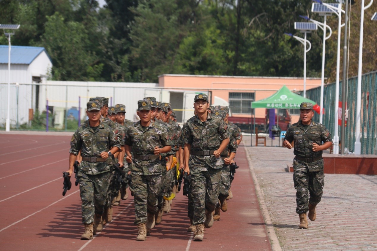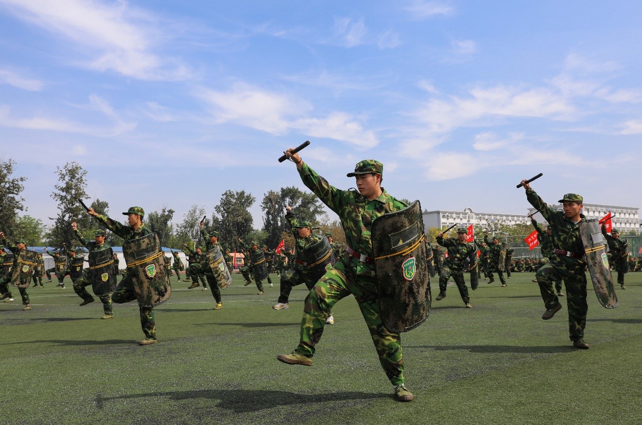 教官一声令下,动作整齐划一,迈着铿锵有力的步伐,警棍盾牌术方阵、匕首操方阵、刺杀操方阵、擒敌拳方阵,依次进行军训科目展示。警棍盾牌术方阵,集劈、戳、撩、抡、扫于一身,杀声震天,尽展军人血性;匕首操方阵,快捷流畅,刀起是飒爽,刀落是坚定;刺杀操方阵,动作的“快准狠”,打出了气吞山河的气势;擒敌拳方阵在一招一式中,气势威武,动作娴熟而又充满力度。战术科目队伍,更是将反应迅速、英勇顽强、协同配合默契的战斗作风展现得淋漓尽致,获得阵阵掌声。