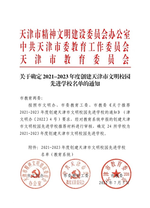 近日,市文明办、市教育两委联合下发《关于确定2021-2023年度创建天津市文明校园先进学校名单的通知》,贝博获评2021-2023年度创建天津市文明校园先进学校。