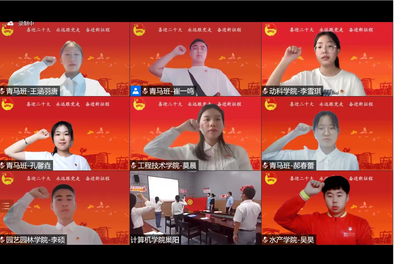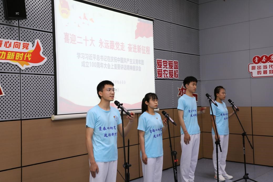 座谈会上,“天津青年创新能手”青年教师刘文、“中国大学生自强之星”工程技术学院莫晨等20余名青年代表,通过现场和线上,结合理论学习、学业成长、实践锻炼、志愿服务和校园生活等先后发言。团员代表演出《喜迎二十大 奋斗正青春》原创诗歌朗诵。最后,青年代表一起重温入团誓词,感悟初心使命。
