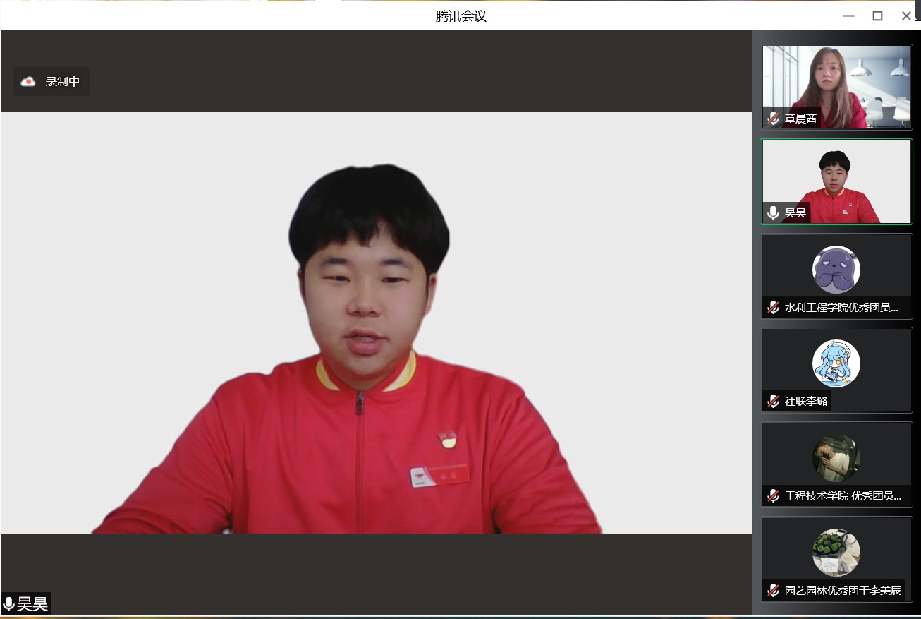 活动在师生齐声高唱国歌中拉开序幕。活动中,马克思主义学院张春莹老师以“弘扬五四精神 争做有为青年”为主题讲授了一堂生动的微团课,带领团员青年共同学习了习近平总书记在中国人民大学考察时的重要讲话精神,一起重温五四运动的重大意义,倡导团员青年牢记习近平总书记嘱托,争做新时代中国青年,把对祖国血浓于水、与人民同呼吸共命运的情感贯穿学业全过程、融汇在事业追求中。市五期青马学员、校学生会执行主席、水产学院吴昊同学,校五四红旗团支部代表、动物科学与动物医学学院2019级动药1班团支部书记李雪琪同学与参加活动的师生交流了心得体会。吴昊在交流时说:“要带头践行五四精神,加强政治理论学习,在理论学习中找寻‘真理的味道’,从党的奋斗历程中赓续红色精神。”李雪琪说:“要牢记习近平总书记嘱托,着力提升团支部的引领力、组织力、服务力和大局贡献度,用青春热血续写时代荣光。”