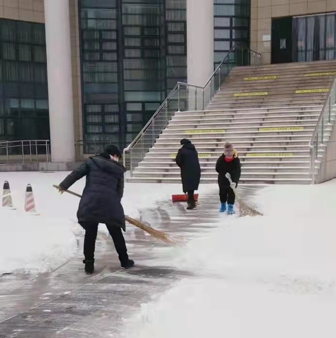 居住在疫情管控区的教师党员在社区清扫积雪,畅通社区道路