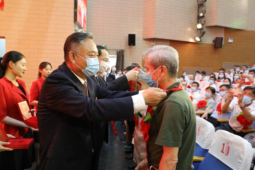 校领导向老党员同志代表颁发“光荣在党50年”纪念章。