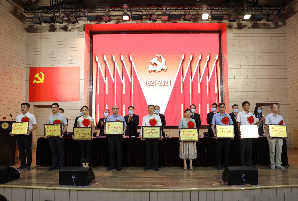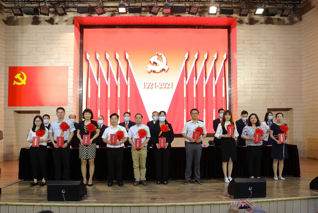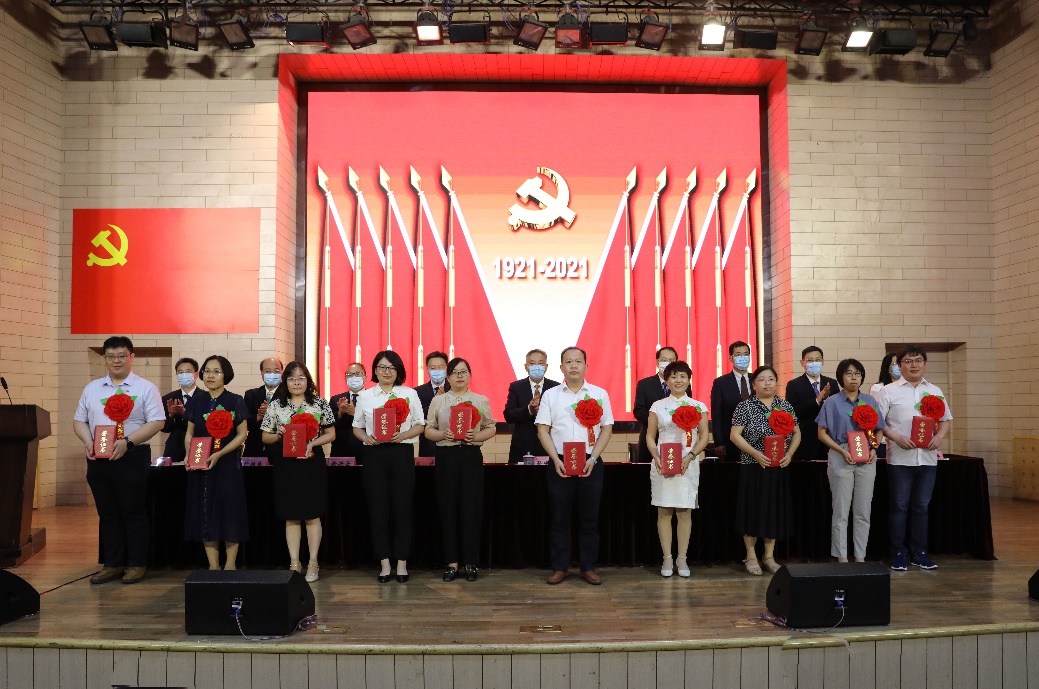 主席台领导向校级先进基层党组织、优秀共产党员、优秀党务工作者颁奖。