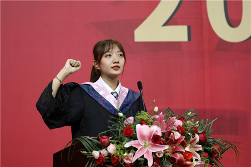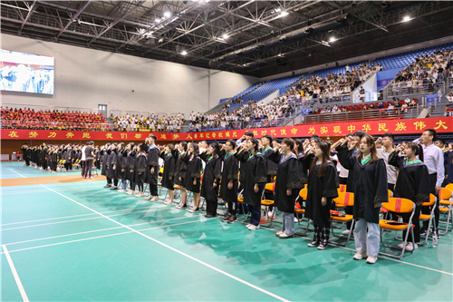 经济管理学院会计学专业毕业生杨芸艺带领全体毕业生郑重宣誓,担当社会责任,胸怀天下,为实现中华民族伟大复兴的中国梦不懈奋斗。毕业是人生旅程的新起点,为表达母校的诚挚祝福,由大学生艺术团师生为全体毕业生倾情演唱《我和2035有个约》。
