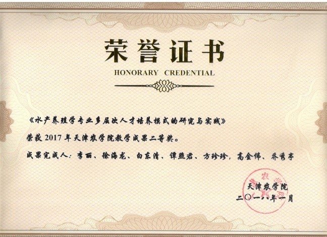 2020年,该专业对标“金专”“金课”建设要求,经过多轮论证,修订完善了人才培养方案和教学大纲,将课程思政有机融入所有课程,深化“专业+”产学研用协同育人模式,坚定学生理想信念,厚植爱党爱国爱农爱校情怀。建设天津市一流本科课程1门、校级一流课程6门、校级思政示范课3门。本科生获批国家级大创项目3项、市级3项、校级2项,4人获天津市思政课公开课大赛市级三等奖,3人获天津市高校第二届心理美文朗诵大赛市级三等奖,1人获天津市学宪法讲宪法演讲比赛普通高校组三等奖,所在实践团队被评为天津市级优秀志愿团队,2人获人民政府奖学金,9人获校级三好学生,3人获校级优秀干部,13人获院级三好学生,11人获院级优秀干部。有7个班级获校级先进集体称号。(教务处供稿;文字/图片:水产学院 王庆奎;编辑:黄宝霞;审校:田健 赵斌)