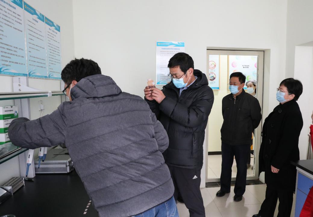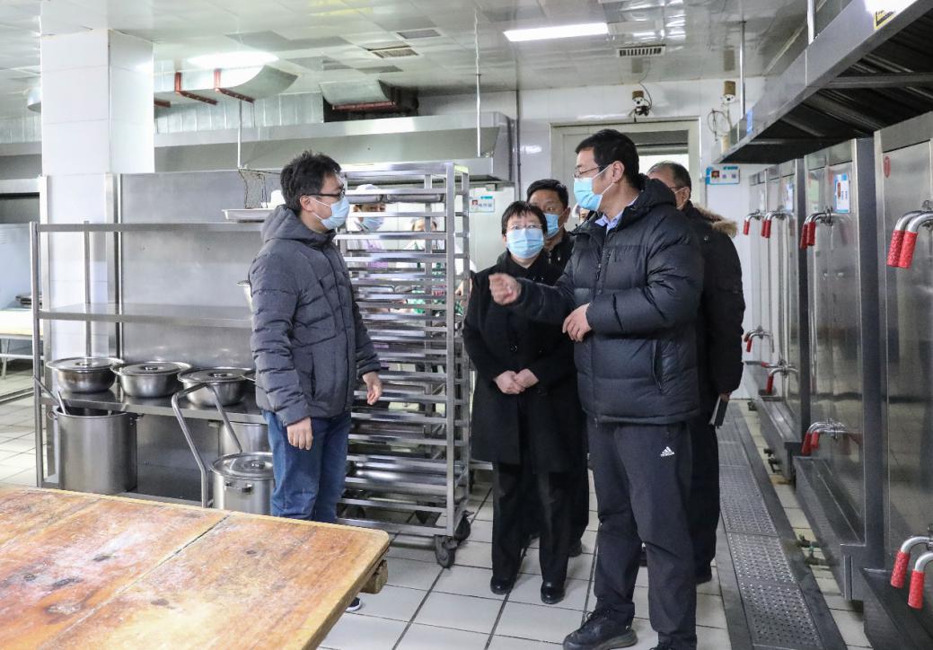 王繁珍带领检查组先后检查了聚贤餐厅主副食库、粗加工间、主副食加工间、备餐间、售餐间、洗消间以及食品快速检测实验室,详细了解食堂落实食品安全管理情况和各工作环节疫情防控举措。