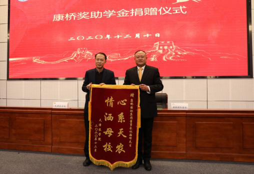王延文代表学校师生欢迎康桥国际集团董事长林海峰校友回到母校,感谢其善心和义举,并向林海峰赠送“心系天农 情洒母校”锦旗。他对毕业校友和受奖助学生提出三点希望,一是希望校友在社会大环境中继续努力,创造新的业绩;二是希望校友们常回家看看,一如既往地关心支持学校的建设和发展;三是希望受奖助的同学珍惜时光,化感激之情为力量之源,刻苦学习,奋发图强,乘势而上,为实现乡村振兴和农业农村现代化贡献自己的力量。
