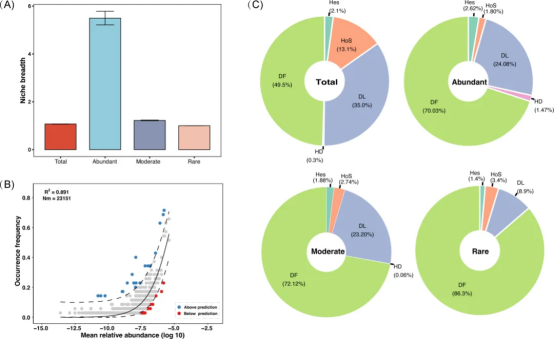 图3微生物群落的生态位广度和各种生态过程对微生物群落的贡献