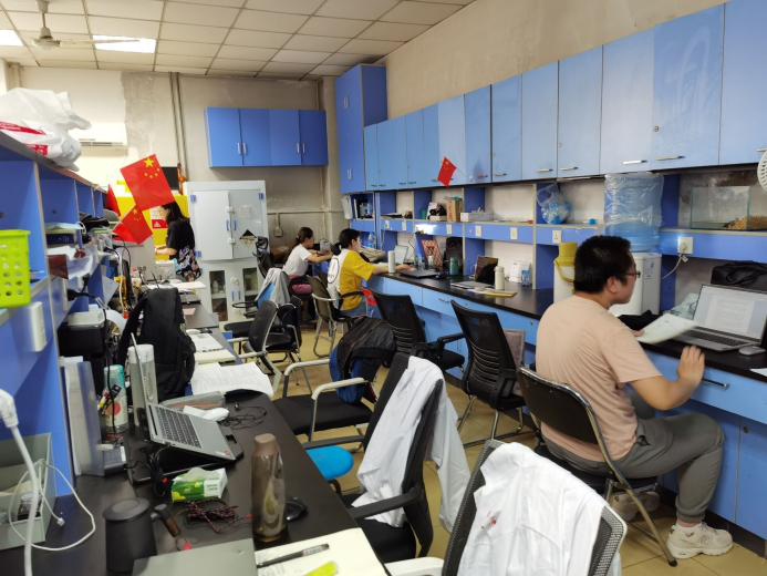 躬勤楼109实验室,是循环水养殖实验室,拥有完善的循环水养殖系统,是水产学院校内养殖基地,该实验室包括淡水鱼,海水鱼,虾类以及贝类养殖。促进了饲料、病害、免疫和育种的科研工作有效开展。程镇燕、梁爽、张达娟等老师的学生正在进行日常养殖工作及采样工作。