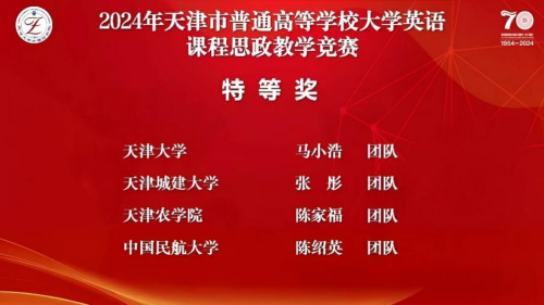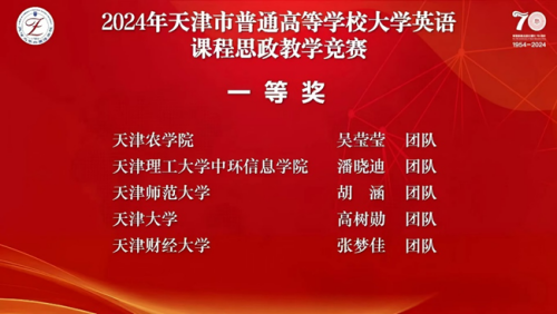 近日,天津市普通高等学校大学英语课程思政教学竞赛决赛在天津大学北洋园成功举行并圆满结束。贝博参赛的两个教学团队在比赛中表现出色,取得优异成绩,其中,陈家福老师教学团队(成员:李然、韩晓洁)荣获特等奖,并将代表天津市参加全国外语课程思政优秀教学案例征集与交流活动;吴莹莹老师教学团队(成员:刘丽萍)荣获一等奖。