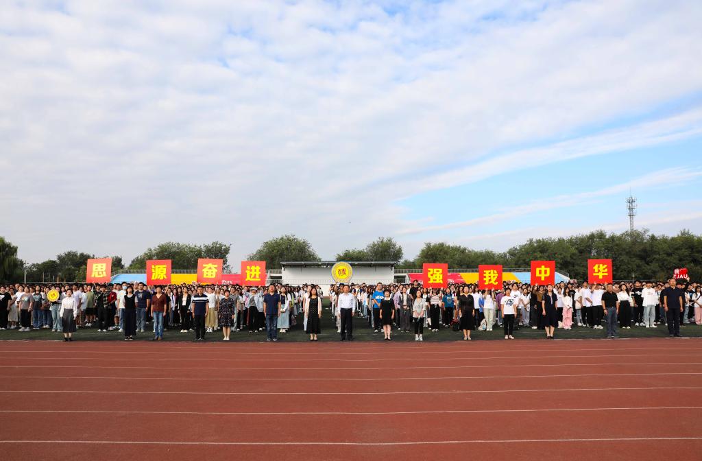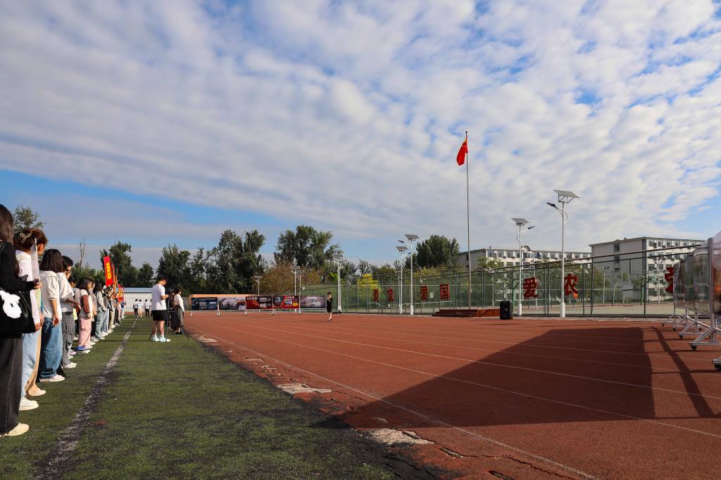 “全体都有,向前看齐。升国旗,奏唱国歌。”上午8时许,伴随着一声号令,全场响起《义勇军进行曲》,英姿飒爽的升旗手高高扬起国旗,鲜艳的五星红旗冉冉升起,全体师生肃立行注目礼。