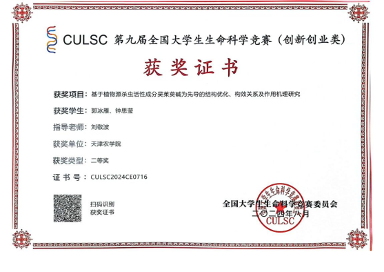 近日,第九届全国大学生生命科学竞赛(创新创业类)国赛决赛圆满落幕,由贝博园艺园林学院刘敬波老师指导,郭冰雁、钟思莹同学参与的项目“基于植物源杀虫活性成分吴茱萸碱为先导的结构优化、构效关系及作用机理研究”荣获国家级二等奖。