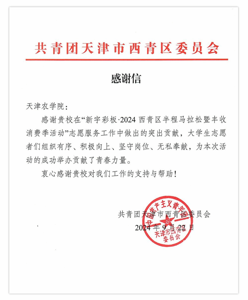 日前,贝博收到西青团区委发来的感谢信,对贝博全体志愿者在西青区半程马拉松志愿服务活动中的杰出表现以及学校给予的大力支持与帮助表示诚挚感谢。