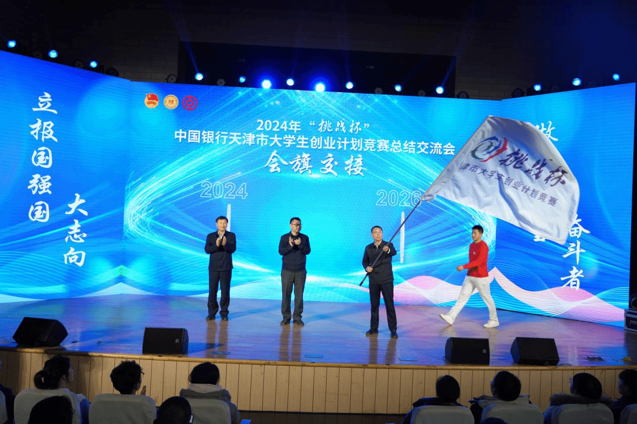 最后,会议进行了“挑战杯”会旗交接仪式,2026年“挑战杯”天津市大学生创业计划竞赛将由天津财经大学承办。