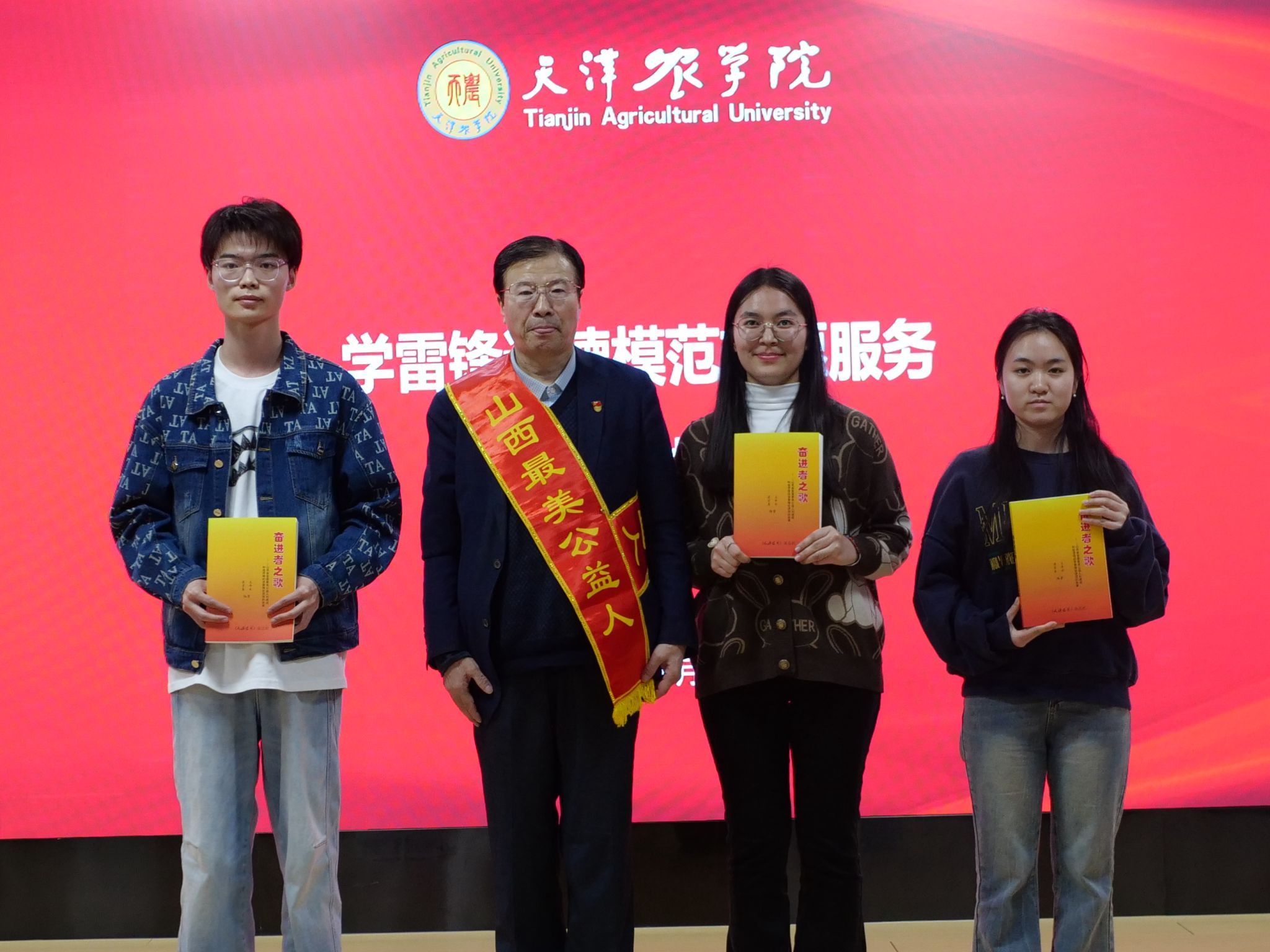 宣讲团为贝博青年志愿者代表赠送书籍《奋进者之歌——山西省首届最美公益人刘建成和他带领的学雷锋巡讲团的故事》。