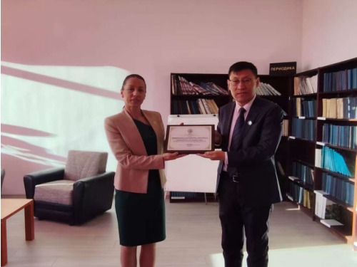 副校长张民向校长伊万诺娃赠送贝博纪念牌匾