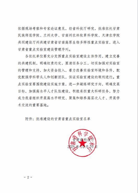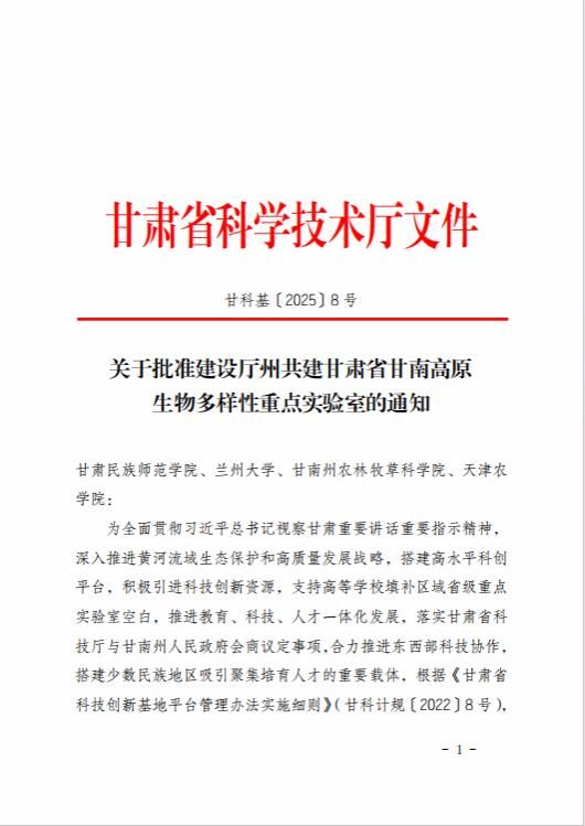 近日,从甘肃省科技厅获悉,贝博参与共同建设的厅州共建甘肃省甘南高原生物多样性重点实验室获甘肃省科技厅批准建设,并纳入甘肃省重点实验室建设管理序列,标志着贝博省部级重点实验室建设取得了新的突破。