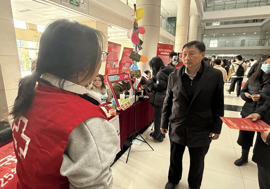 宋涛走访学生社团展示区,互动体验活动项目,与社团成员亲切交流,希望学生社团坚持校园文化主题,在教师指导下,围绕校园学习、生活、实践,精心设计活动议题,丰富活动内涵,提高同学参与度,提升社团活动质量,助力学生成长。