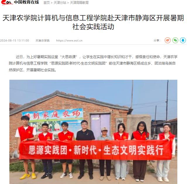 2024年8月15日,中国教育在线网报道计算机与信息工程学院“思源实践团·新时代·生态文明实践团”前往天津市静海区杨成庄乡、团泊湖鸟类自然保护区,开展暑期社会实践。