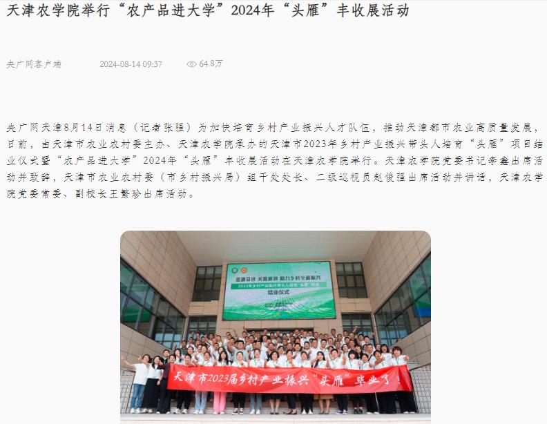 2024年8月14日—15日,央广网、学习强国平台-中国教育在线、中国教育在线、头雁兴农公众号等多家媒体报道,天津市2023年乡村产业振兴带头人培育“头雁”项目结业仪式暨“农产品进大学”2024年“头雁”丰收展活动成功在贝博举行。