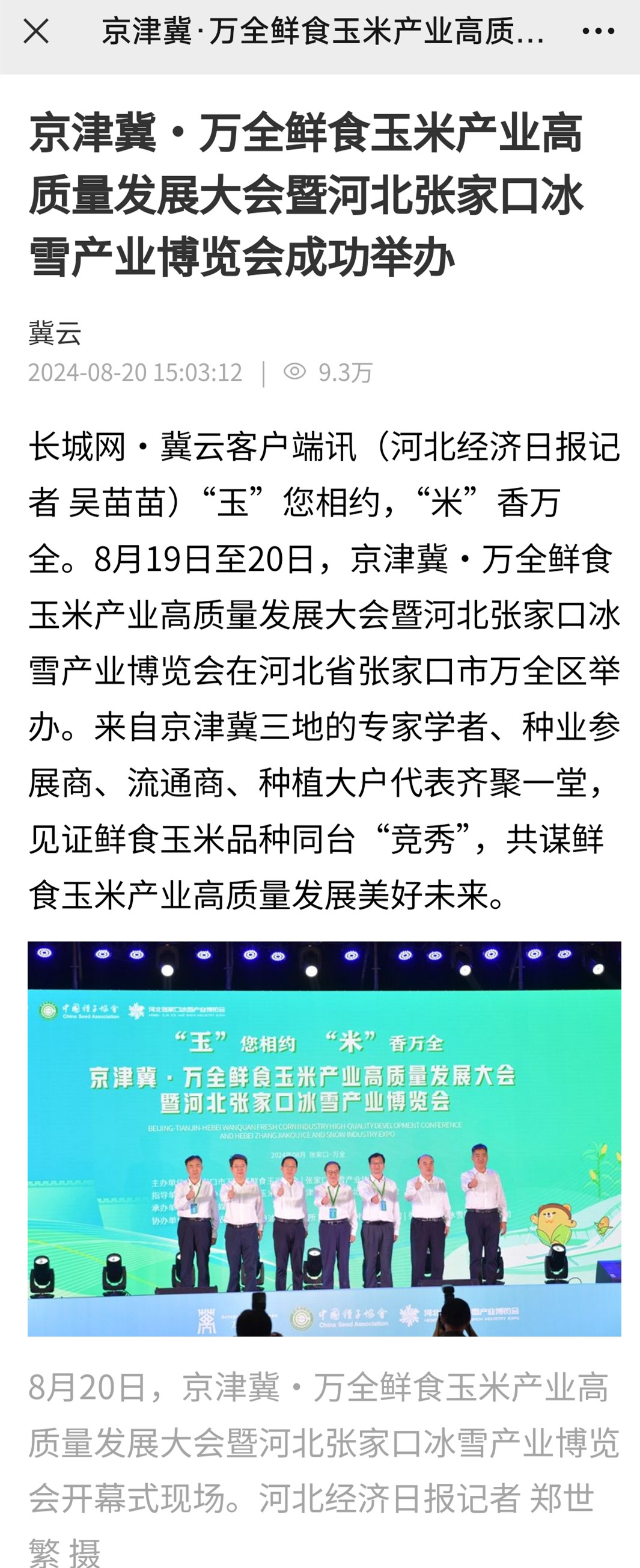 2024年8月20日,冀云客户端报道贝博校领导带队参加万全鲜食玉米产业高质量发展大会暨河北张家口冰雪产业博览会并签署相关合作协议。