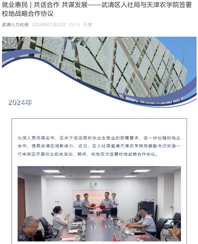 2024年7月22日,武清人力社保公众号报道武清区人社局邀请校党委副书记宋涛一行到武清区开展访企拓岗活动,期间,校地双方签署校地战略合作协议。