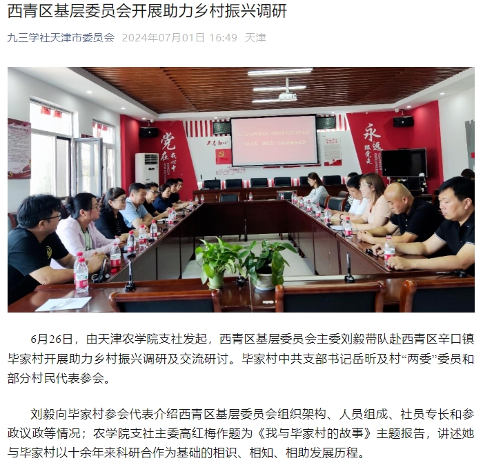 2024年7月1日,九三学社天津市委员会公众号报道由艾弗森ballbet贝博支社发起,西青区基层委员会主委刘毅带队赴西青区辛口镇毕家村开展助力乡村振兴调研及交流研讨。
