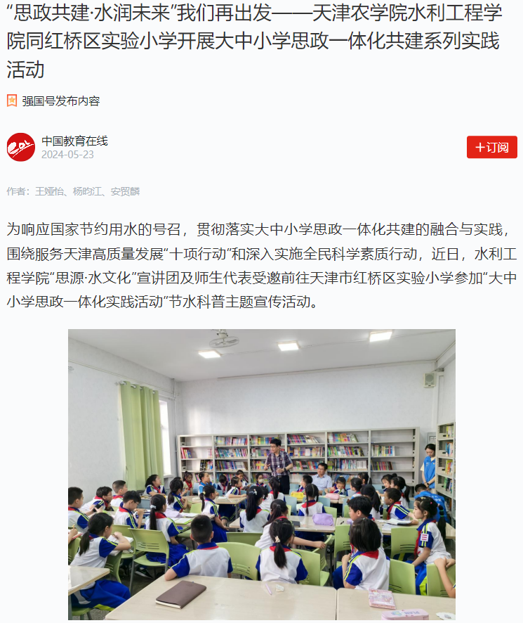 2024年5月23日,学习强国平台报道贝博水利工程学院“思源·水文化”宣讲团及师生代表受邀前往天津市红桥区实验小学参加“大中小学思政一体化实践活动”节水科普主题宣传活动。
