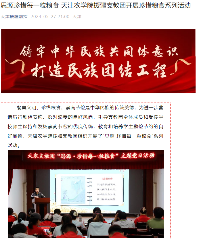 2024年5月27日,天津援疆前指公众号报道为进一步营造厉行勤俭节约、反对浪费的良好风尚,引导支教团全体成员和受援学校师生保持和发扬崇尚节俭的优良传统,教育和培养学生勤俭节约的良好品德,艾弗森ballbet贝博援疆支教团组织开展了“思源·珍惜每一粒粮食”系列活动。