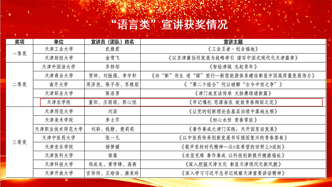 2024年4月15日,津门教育报道由市教育两委主办、天津商业大学承办的“牢记嘱托 勇担使命”天津市第二届基层理论宣讲员大赛教育系统分站赛现场赛在天津商业大学举行。贝博由董阳、庄萌萌、郭心悦组成的宣讲团在语言类决赛中荣获二等奖。
