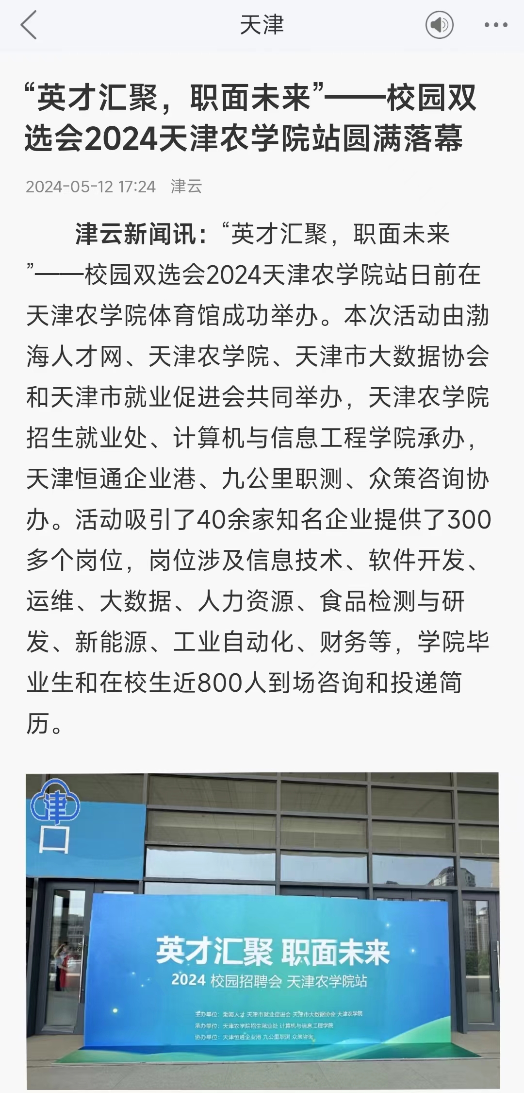 2024年5月12日,津云报道“英才汇聚,职面未来 ”——校园双选会2024艾弗森ballbet贝博站在贝博体育馆成功举办。活动吸引了40余家知名企业提供了300多个岗位,岗位涉及信息技术、软件开发、运维、大数据、人力资源、食品检测与研发、新能源、工业自动化、财务等。