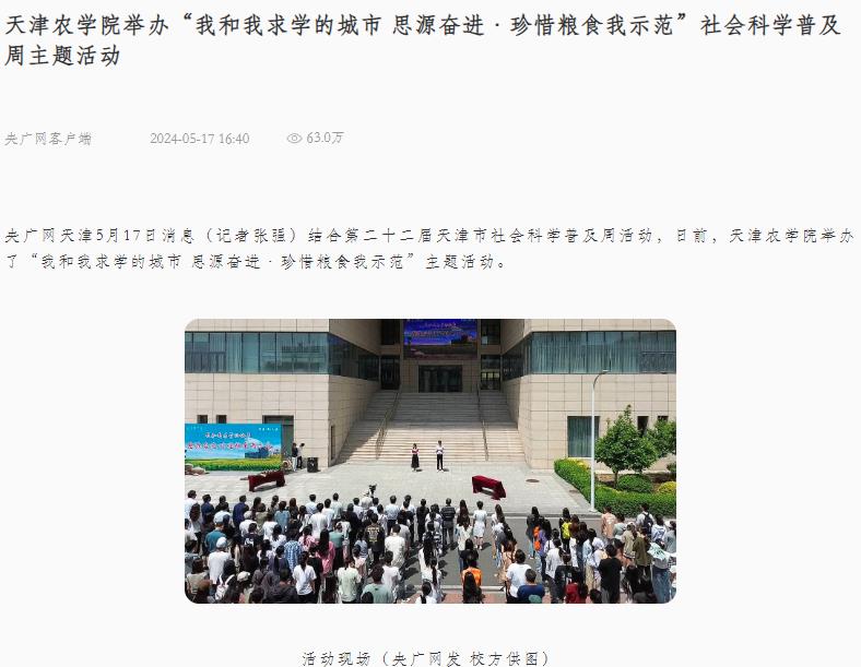 2024年5月17日,央广网客户端报道贝博举办“我和我求学的城市 思源奋进·珍惜粮食我示范”社会科学普及周主题活动。