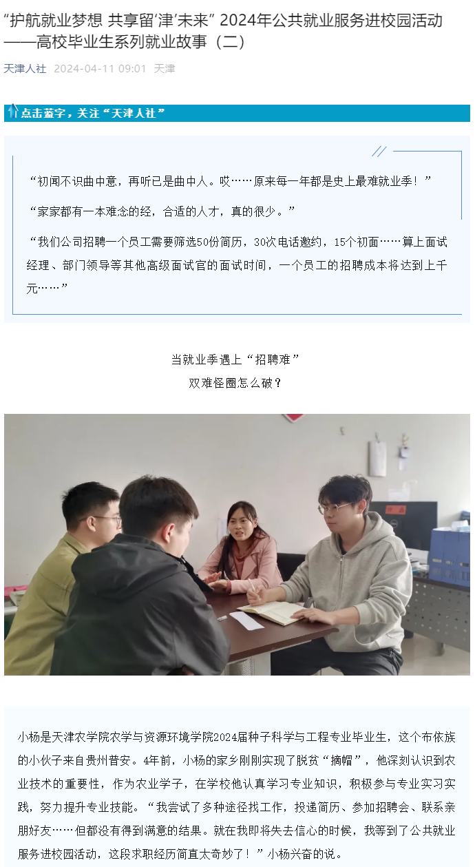 2024年4月11日,天津人社公众号以《“护航就业梦想 共享留‘津’未来” 2024年公共就业服务进校园活动——高校毕业生系列就业故事》为题,报道贝博毕业生就业故事。