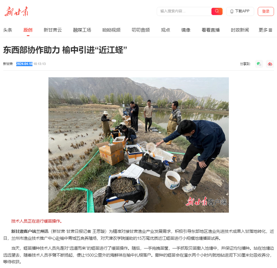 2024年4月18日,新甘肃客户端报道国家贝类产业技术体系天津综合试验站成员、津甘双地科技特派员、贝博水产学院实验师梁健与兰州市渔业技术推广中心合作,援助兰州市榆中青城五良养殖场15万粒近江蛏苗种,开展池塘试养工作。
