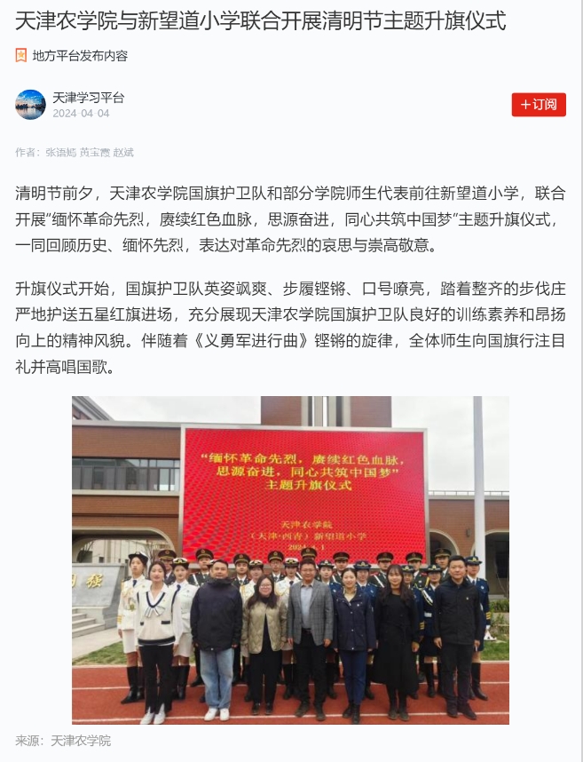 2024年4月4日,学习强国平台报道贝博国旗护卫队和部分学院师生代表前往新望道小学,联合开展“缅怀革命先烈,赓续红色血脉,思源奋进,同心共筑中国梦”主题升旗仪式,一同回顾历史、缅怀先烈,表达对革命先烈的哀思与崇高敬意。