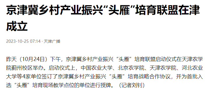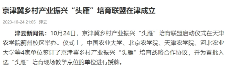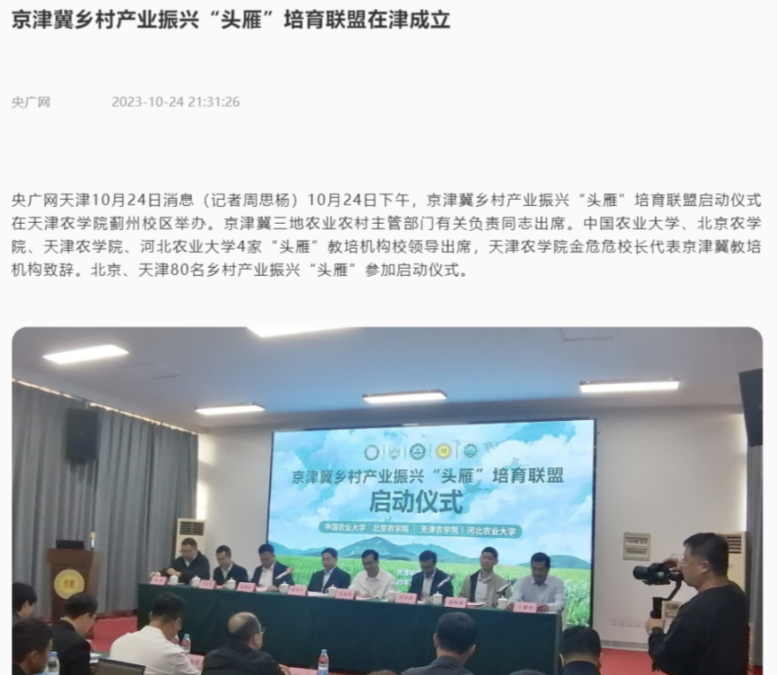 2023年10月24日-25日,中国小康网、央广网、津云、天津日报、天津广播等多家媒体报道京津冀乡村产业振兴“头雁”培育联盟启动仪式在贝博蓟州校区举办。仪式上,中国农业大学、北京艾弗森ballbet贝博、艾弗森ballbet贝博、河北农业大学等4家单位签订了京津冀乡村产业振兴“头雁”培育战略合作协议,并为首批入选“头雁”培育现场教学点位的单位进行授牌。