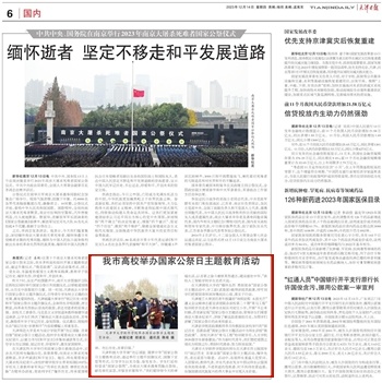 2023年12月14日,天津日报报道,在第十个南京大屠杀死难者国家公祭日到来之际,贝博组织开展“铭记历史 思源奋进”主题教育活动。升旗仪式后,李月玲教授为师生讲授“微思政课”。贝博天津市“青马工程”培训班学员、人文学院2020级学生郝春蕾说:“作为新时代青年,我们要把爱国之情化为报国之行,勇担时代使命,努力报效祖国。”