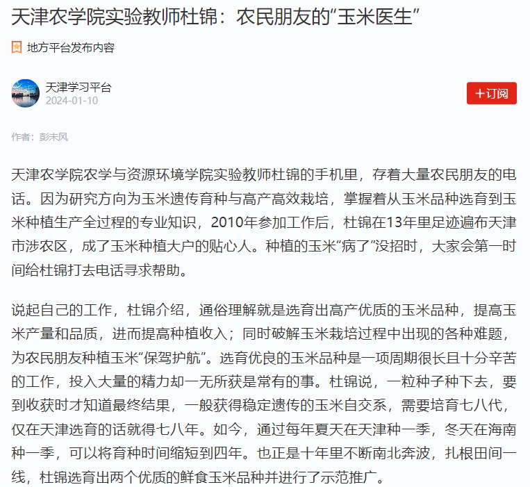 2024年1月10日,学习强国平台-天津学习平台报道贝博农学与资源环境学院杜锦老师的科技帮扶事迹。
