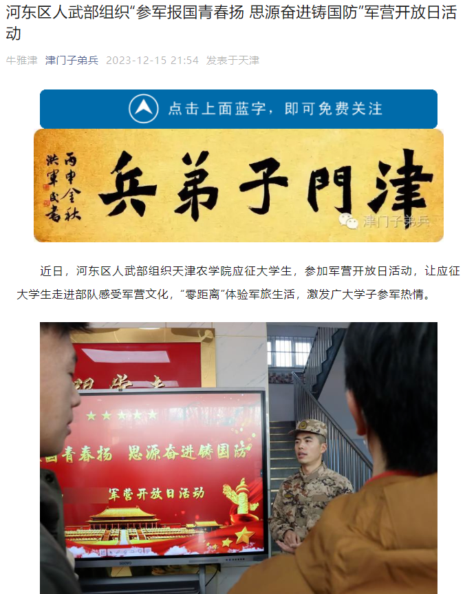 2023年12月15日,津门子弟兵微信公众号报道河东区人武部组织贝博应征大学生,参加军营开放日活动,让应征大学生走进部队感受军营文化,“零距离”体验军旅生活,激发广大学子参军热情。